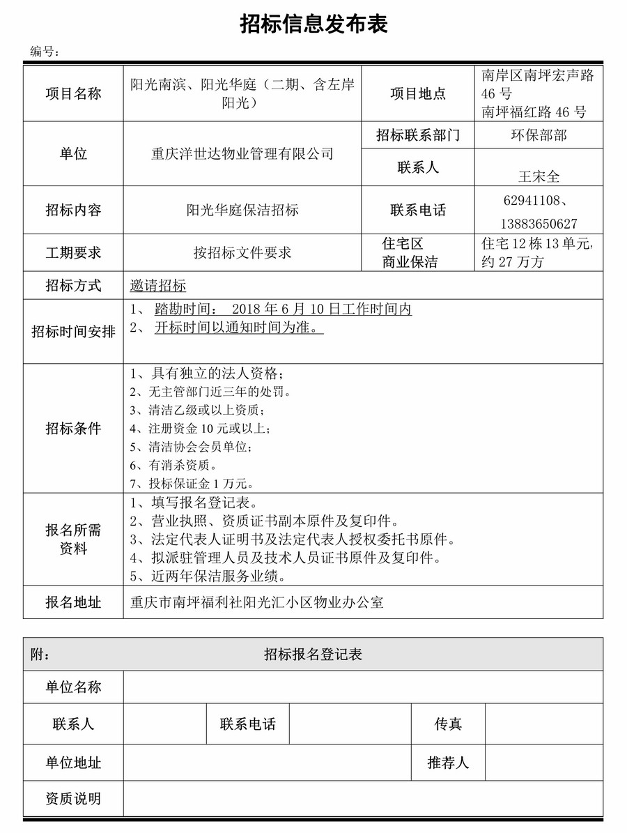 陽光華庭、陽光南濱保潔招標