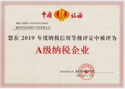 重慶洋世達(dá)實(shí)業(yè)(集團(tuán))有限公司、重慶洋世達(dá)房地產(chǎn)開發(fā)有限公司在2019年度納稅信用等級(jí)評(píng)定中被重慶市南岸區(qū)稅務(wù)局評(píng)為A級(jí)納稅企業(yè)。